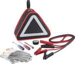 The Emergency Auto Kit features a zippered reflective carry case with open storage pocket contains 100-amp jumper cables, flathead screwdriver, Phillips-head screwdriver, rubber electrical tape, rubber friction cotton gloves and a tire gauge. It also has a reinforced top carry handle. Refer to the car manufacture manual for choosing jumper cables with an amperage rating that matches your car's battery needs to ensure safe and effective jump starting.